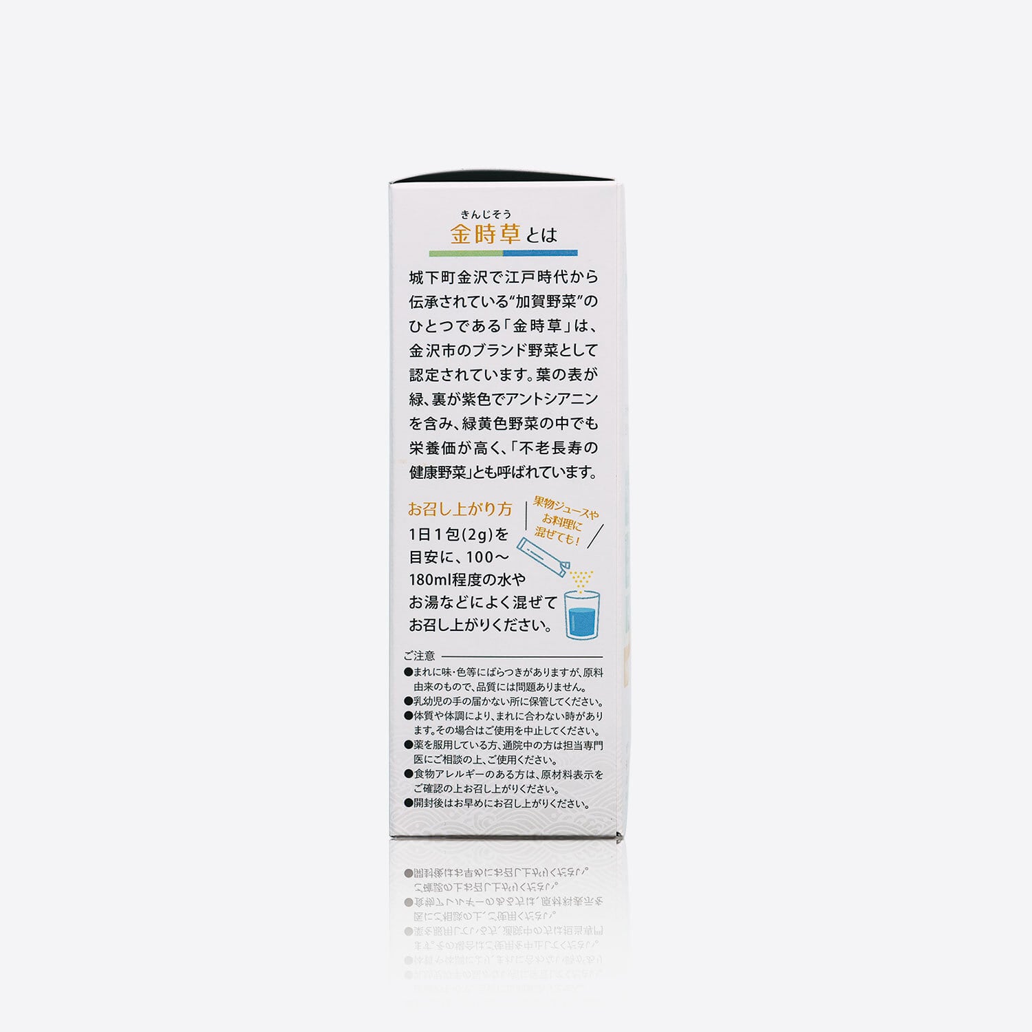 原材料:金時草乾燥粉末100%(石川県、環境に優しい循環型農業で栽培された金時草だけを使用)